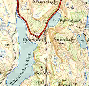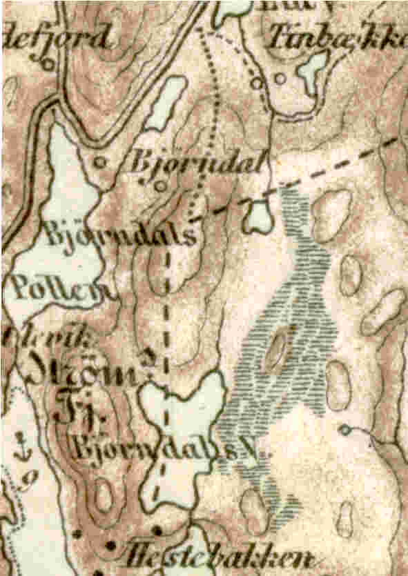 Veisystemet rundt den nordre delen av Bjørndalspollen så slik ut til slutten av 1950-tallet da veien til Håkonsvern ble bygd. Hovedveien til Bergen gikk mellom Våningshuset til Bjørndal og Sildaberget. Bekken fra Bjørndalstjernet til Bjørndalspollen hadde et fall på 31 meter og var en energikilde til både kvern og sag. Sæterdal (helt sør på kartet) er bruk nummer 5.