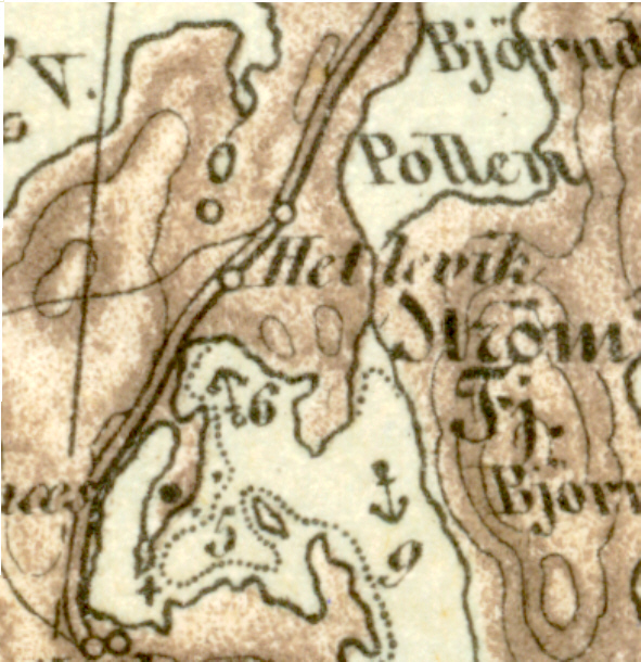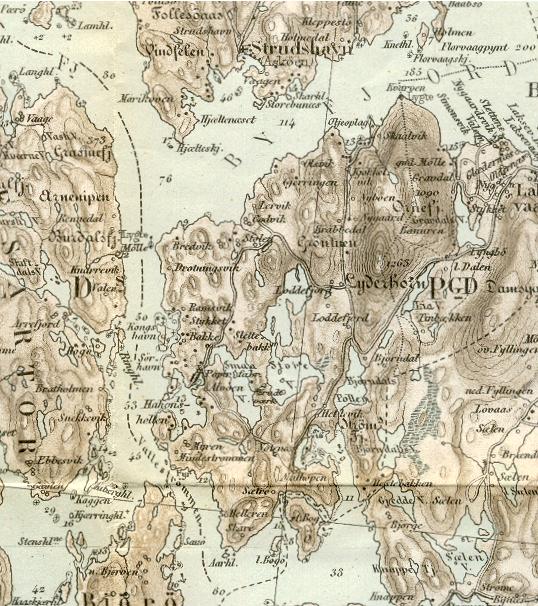 Dette kartutsnittet fra et kart utgitt i 1873, viser Hetlevik med tre våningshus.