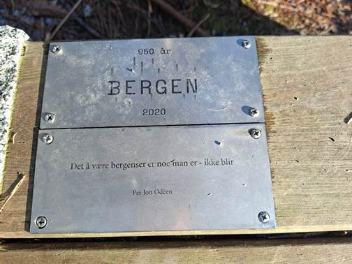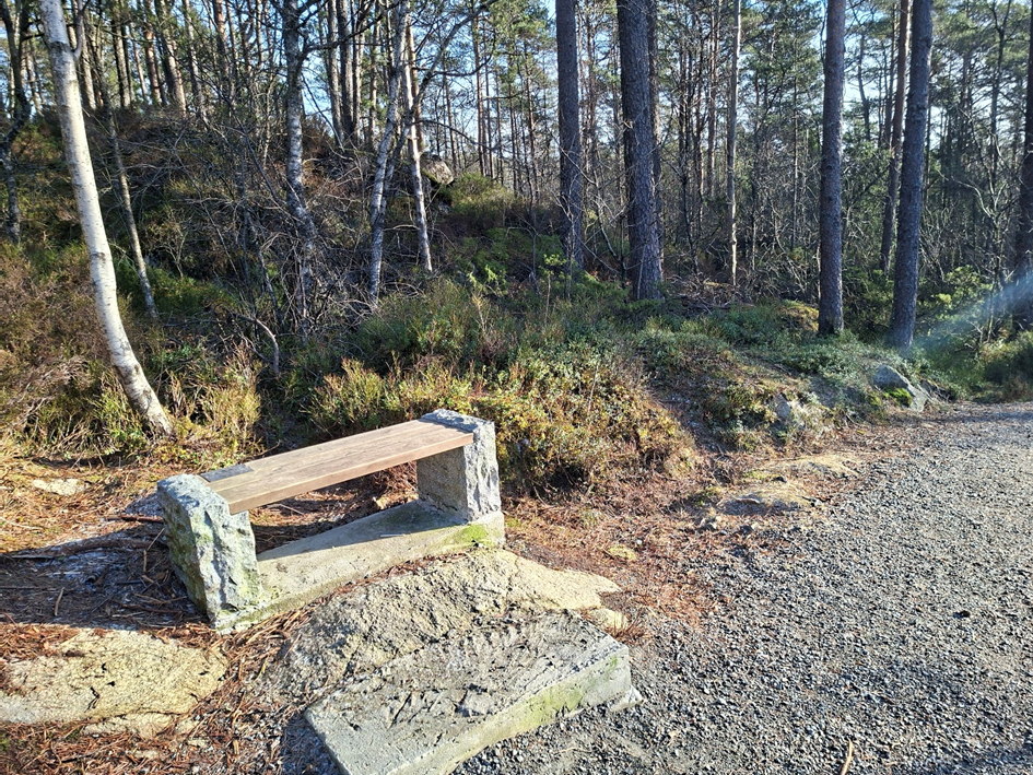 I november 2024 satte Alvøskogens Venner opp denne benken øst for Vardavatnet. Den har en inskripsjon om det å være og bli bergenser.