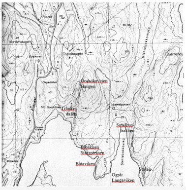 Kartet nedenfor viser stedsnavn på og rundt Slettebakken. Noen av disse må forklares nærmere: