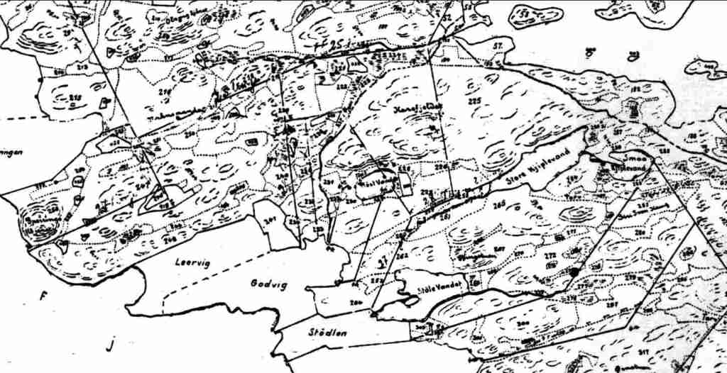 I 1950 var det skilt ut 64 bruksnummer fra gården.