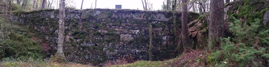 Fylling for vannrenne fra demning (fundament 8). Fyllingen er ca. l, 5 m bred i Øvre del. Lengden er ca. 8-10 m. Fyllingen fortsetter inn mot et utsprengt gjel inn mot demningen. Det ligger en del trematerialer igjen på fyllingen og inn mot demningen.