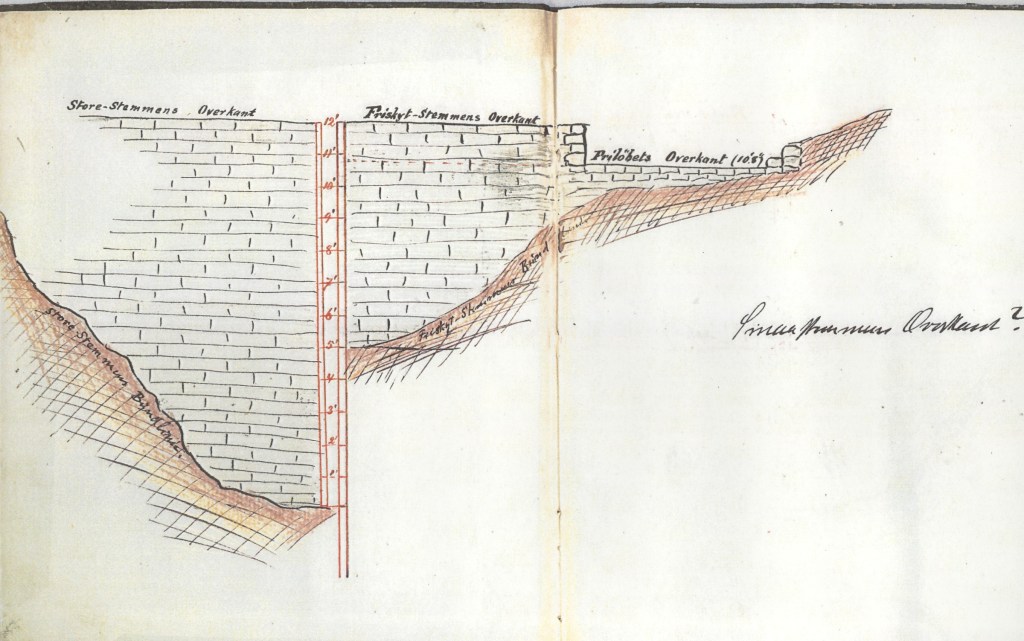 Denne tegningen er fra ca. 1872 og viser demningen slik den var da kruttverket var i drift (1858-1886).