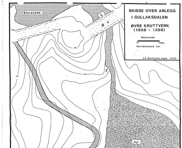 8a er demningen og b er huset der vannet kan stenges. Den grå stripen til venstre er veien ned i Gullaksdalen og det store feltet til høyre er et oppsamlingsbasseng. Det er også en tredje demning øst for huset.
