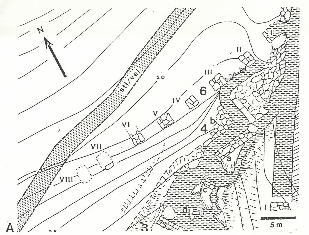 Disse pillarenes retning har intet å gjøre med vanntilførsel til møllene i Gullaksdalen. Som vist på fig. 2 kan denne rennen ha gått inn til bebyggelsen i dalen vest for Gullaksdalen og ført vann dit inn. Det har ikke vært mulig å spore steinfundamenter vest for VIII. Rester av trekonstruksjonen eller forsenkninger i terrenget er ikke påvist.