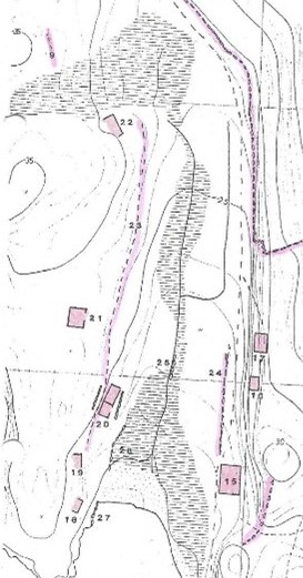 Veien på vestsiden av dalen (fig.22B). Denne veien har en bredde på ca. 1,7 m og er steinsatt. Den kan følges fra sør for fundament 20 og opp til fundament 22 (Fig.2). Det er mulig at den har en videre utbredelse mot nord til åpningen i muren, hvor den knyttes til
