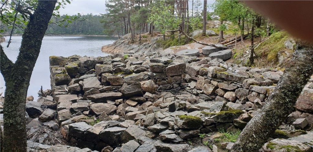 Fundamentet ligger nede ved Småvannet, ved utløpet av bekken/elven i Gullaksdalen. Fundamentet er bygget uten bindemiddel. Det er kun brukt tørrmurer. Hoveddelen av anlegget består av et kvadratisk oppbygget platå som er ca. 10×10 m og ca. 1.5 m over vannflaten (fig 5A). I den østligste delen av platået er det fire nærmest kvadratiske hull (1 m lange, 0,75 m brede). De opptrer i par med avstand ca. 40 cm mellom hvert av to nærstående hull. Det neste par slike hull ligger ca. 3 m lenger mot vest og har omtrent samme størrelsesforhold og avstand. Det øvre platået består av til dels store steinblokker, ofte opptil 1 m lange, særlig i rammen rundt fundamentet. Mot NNØ er det øvre platået ca. 3 m bredt og fortsetter mo NNØ inn mot et sterkt avsmalet parti og ender i en sti eller smal vei. Det øverste platået er ikke fylt opp av finmateriale som grus eller liknende, og en kan derfor anta at det har ligget en treramme som et fundament over dette platået som det så har stått en mølle og eventuelt også et kaianlegg på.