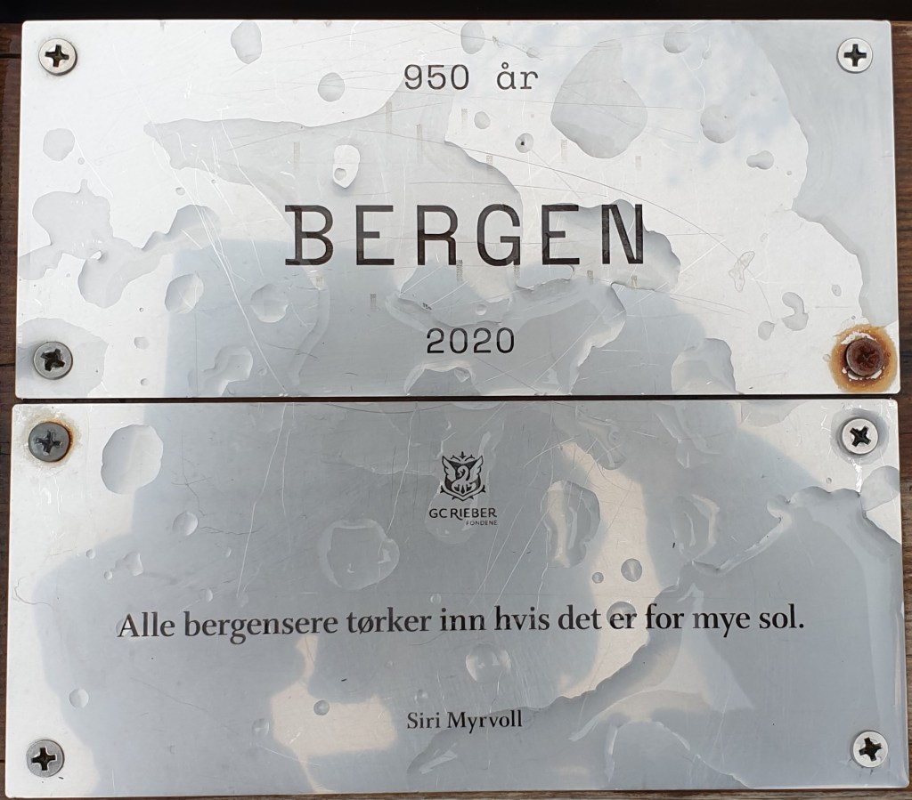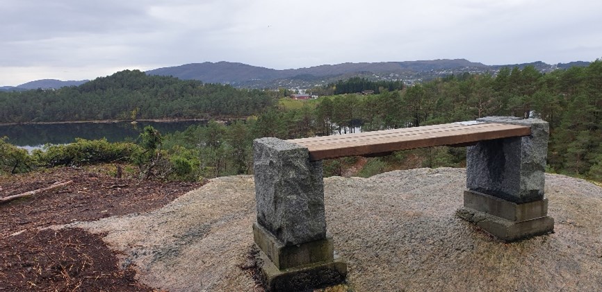 I anledning Bergens 950-års jubileum i 2020, satte Alvøskogens Venner opp fire benker i Alvøskogen. Den første ble satt opp høsten 2018, og den står her på Storemyrshaugen vest for gapahuken ved Storemyren.