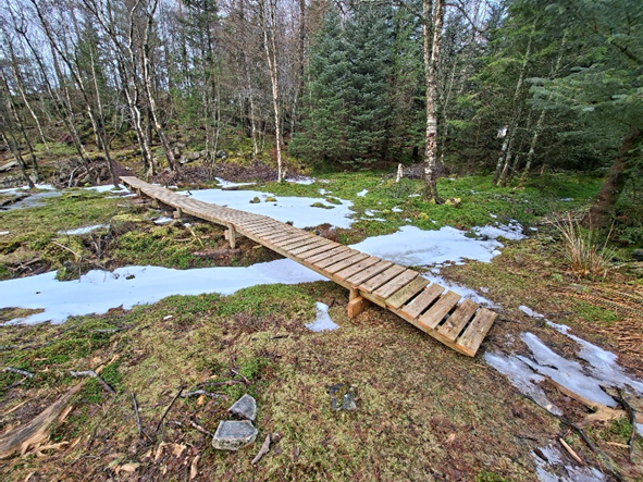 I november 2025 laget Alvøskogens Venner en 15 meter lang klopp med 115 terrassebord som toppdekke over den sumpete viken vest for grindbygningen i Gullaksdalen. Ute på odden satte de opp en benk med utsikt mot sør og vest.