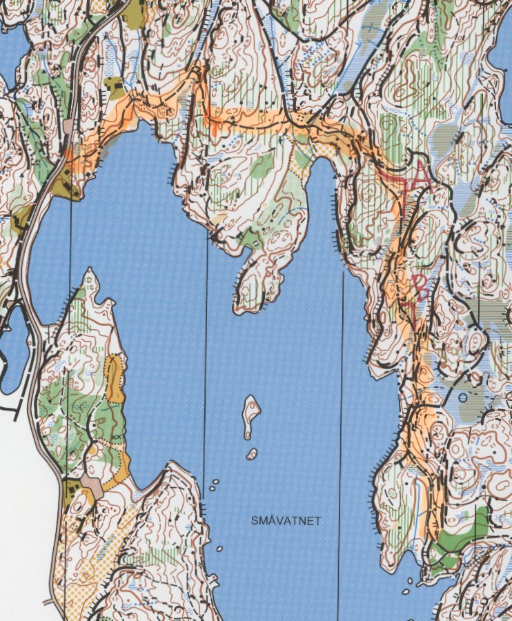 På dette utsnittet, merket A og B, er det tegnet inn med rødt der kløvveien har gått. I april 2022 ryddet Alvøskogens venner disse to strekkene og fikk fram steinsettingen som viser hvor kløvveien gikk.