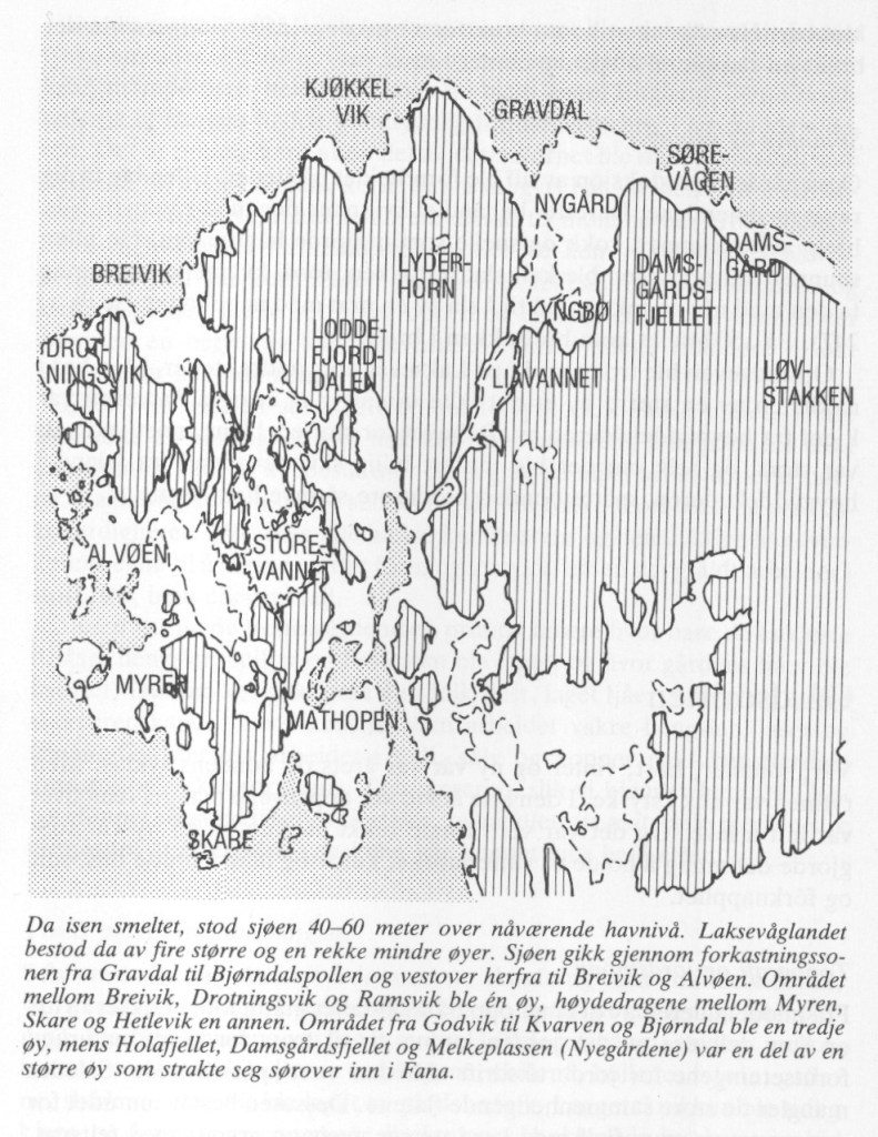 Breen tynget ned landet slik at de mørke partiene lå under vann. Da breen forsvant, hevet landet seg. Opprinnelig gikk havet opp til ca. 50 meter over det som er havnivået i dag. Kilde: Strilesoga, bd. 1