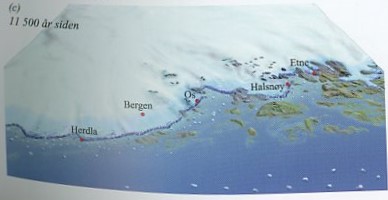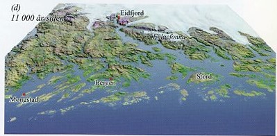 d) 11 000 år siden: Istiden er definitivt slutt og mer og mer land blir isfritt etter hvert som temperaturen øker og breen smelter.