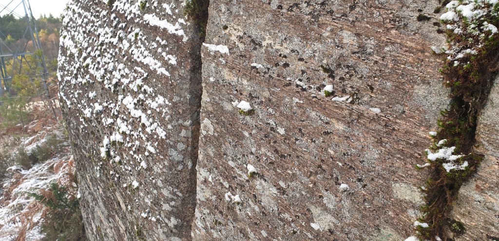 Stripene på denne loddrette fjellveggen ble laget da landet vårt lå under en iskappe som var mellom 200 m og flere tusen meter tykk. Isbreen seg vestover mot havet og tok med seg sand, grus og steinblokker. Det enorme trykket presset steinene mot fjellet og avsatte skuringsstriper. Stripene går fra øst mot vest slik breen gjorde. Den siste istiden begynte for 100 000 år siden og sluttet for 11 500 år siden. I tiden etter har breen smeltet og landet har hevet seg. Storavannet og Småvannet var en gang fjorder med saltvann.